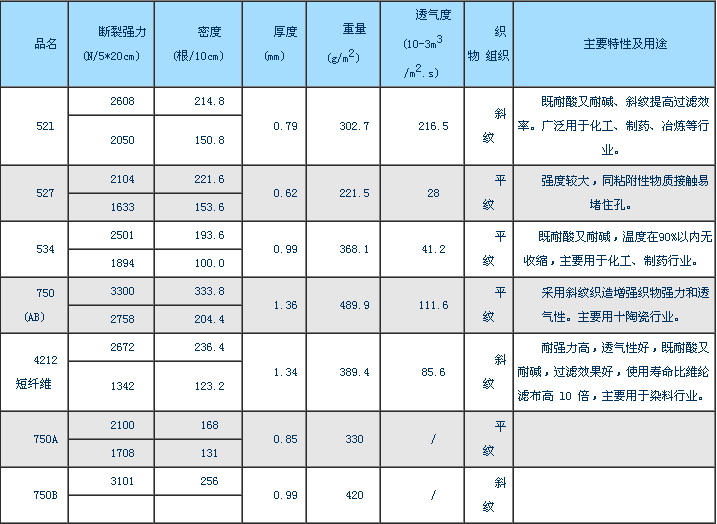 丙綸濾布性能參數