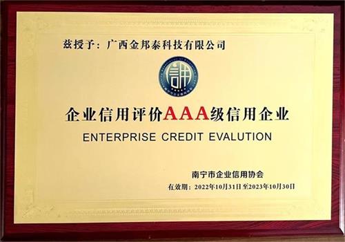 近日,南寧市企業信用協會公布了2022年企業信用等級評價結果,金邦泰榮獲AAA級企業信用等級證書。