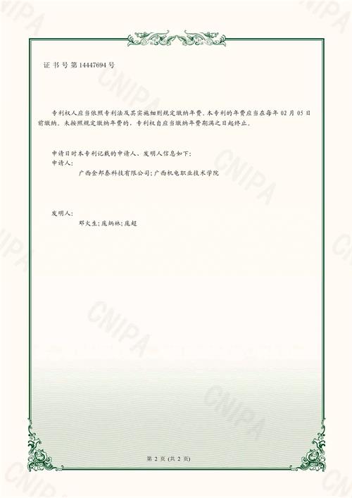 日前,經過我公司和廣西機電職業技術學院技術人員的努力下,共同獲得了兩項實用新型專利。“一種便于更換集塵布袋的集塵裝置”(專利號:ZL202120330886.1)和“一種自動清理高粘度粉塵的布袋集塵裝置”(專利號:ZL202120330889.5),專利證書的獲得進一步增強了我公司的科技研發實力。
